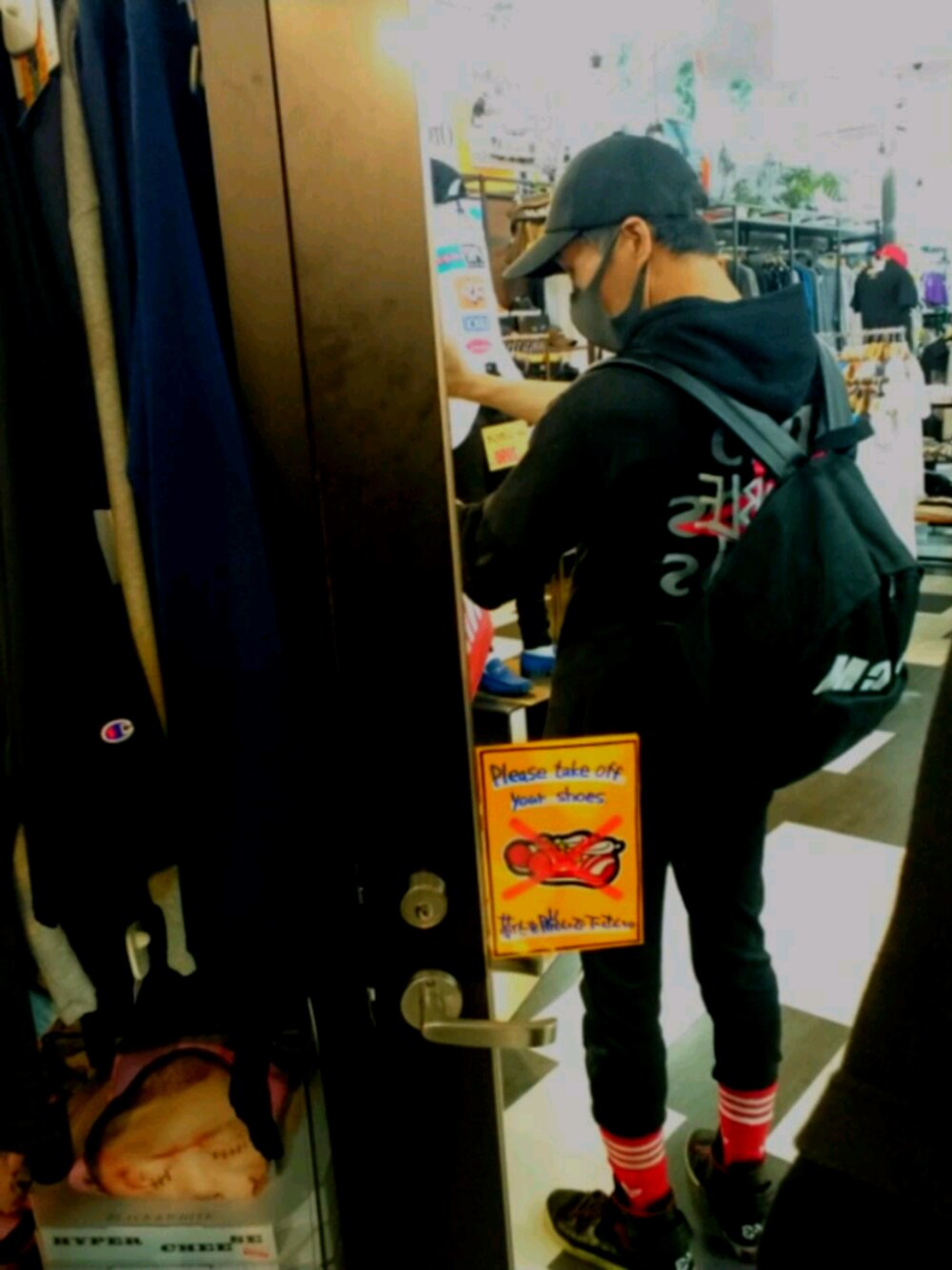 七分袖パーカーの上にTシャツをレイヤード☺️ 全身黒のコーデに、差し色で足元に赤のソックスを❗