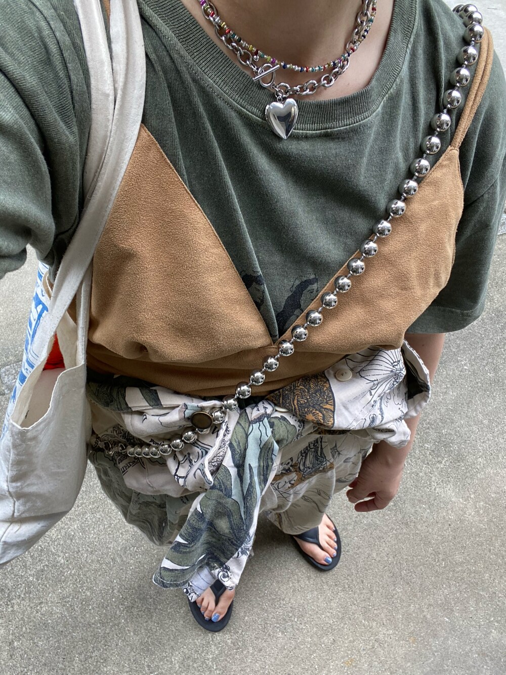 久々このつなぎが着たかったけど暑いから腰巻きで🫡 何かにつけてこのビスチェ🫶使える🫶🫶