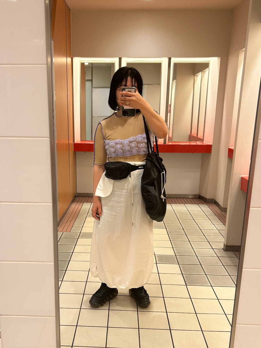 友達とランチ行った日🍽️ 慌てて服決めたから困った時のウエストバッグ。。 腰に巻いといたらいいと思ってる🫨 でもなくてもよかったかもって思ってる🫨🫨