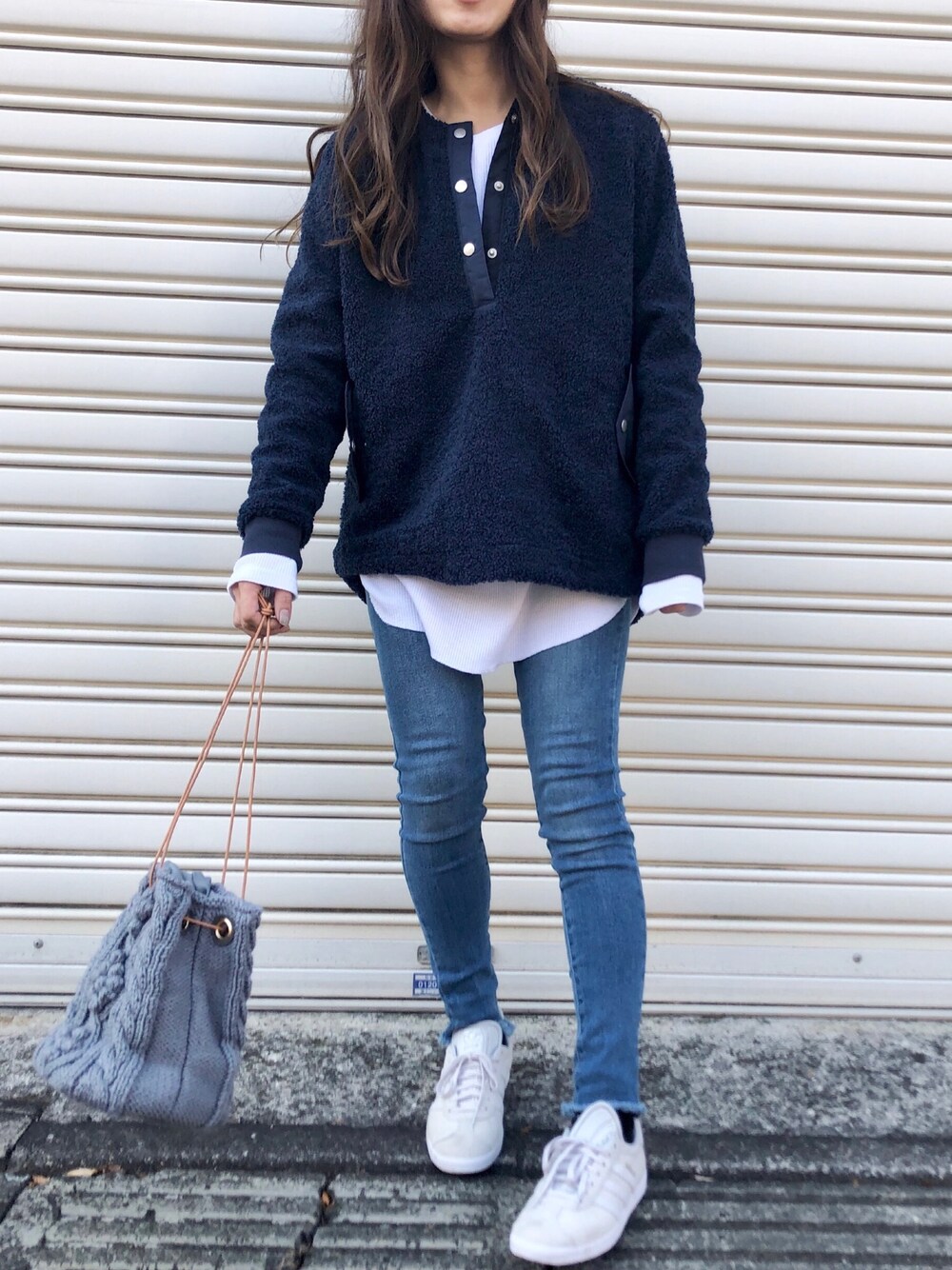 ✔️切替ヘンリーネックボアBigレイヤードSW/Navy ¥5900 innertops/White ¥3900 フレイドヘムストレッチデニムpt/sax Sサイズ Instagramよりご注文頂けます