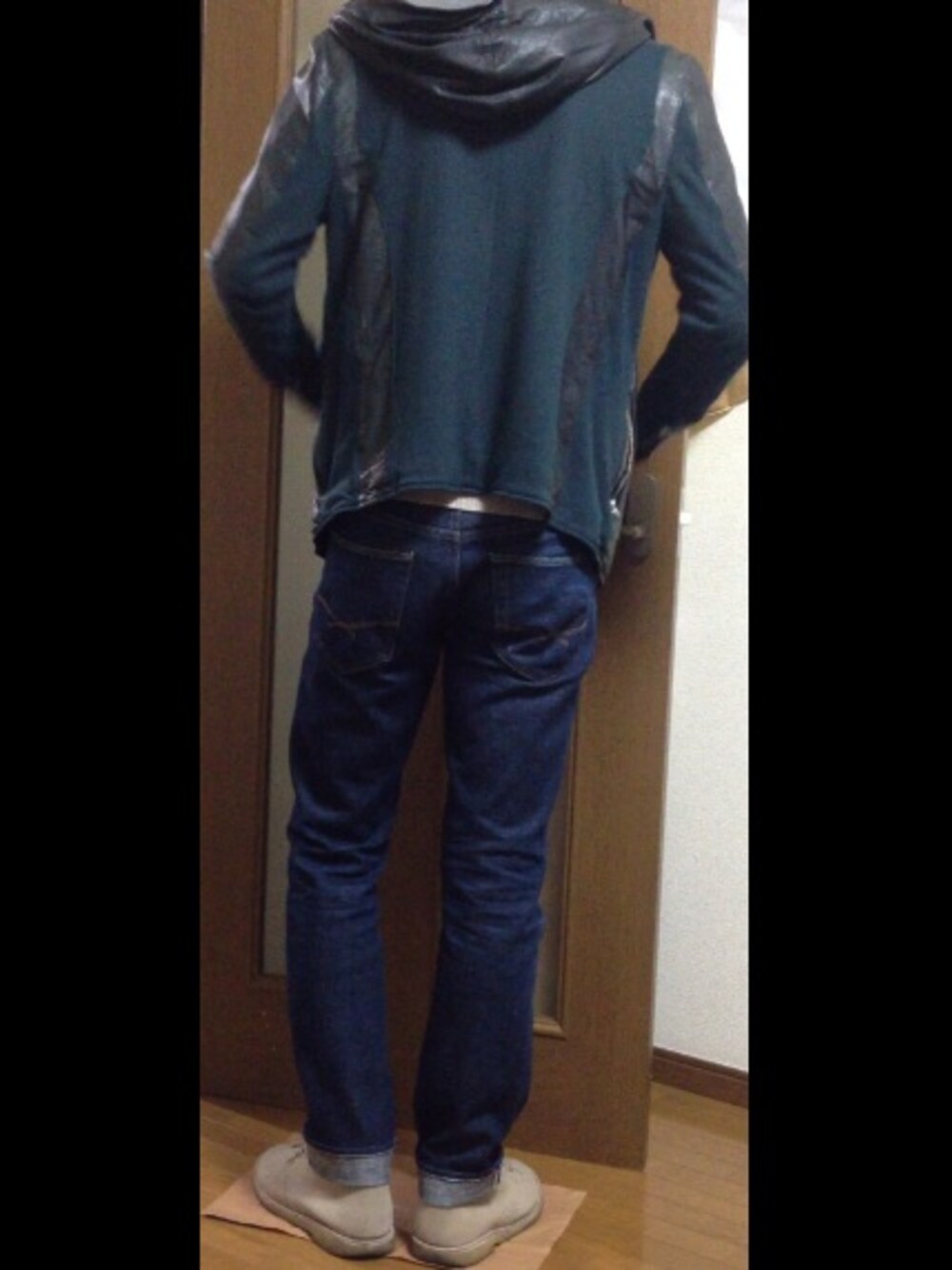 レザージャケット、カーディガン、ジーンズ、デザートブーツ