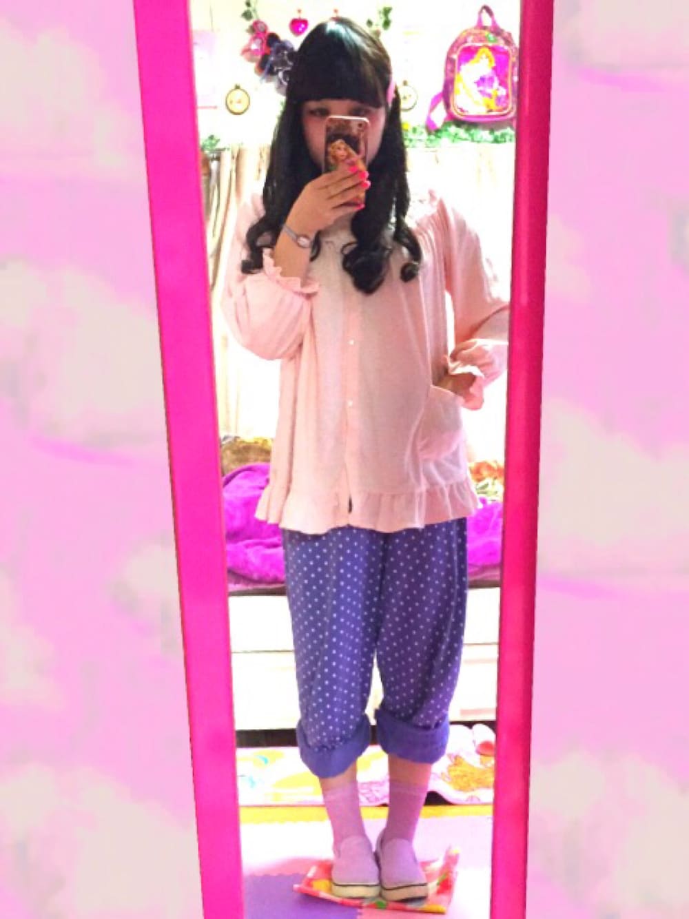 今日のテーマは 🍥おでかけぱじゃま🍥 トップスのいちばんうえのぼたんが 取れてなくなっちゃってたので アイスをつけてみました🍦💕💕 (Instagramみてね) ゆるっとしたコーデだいすき🐶💜