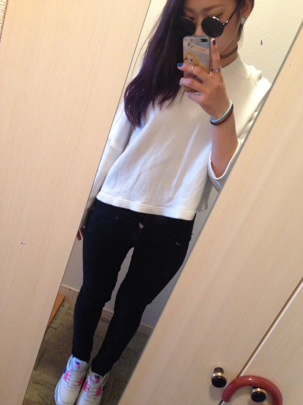 ホワイト系のスニーカー、ブラック系のネックレス、ブラック系のサングラスを着用したレディースの春コーディネートの1枚目の写真
