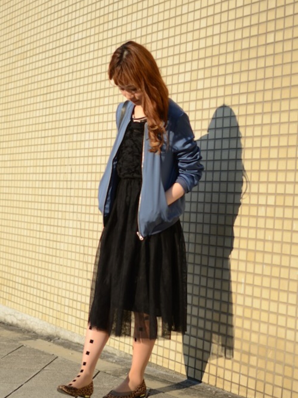ブラック系のタイツ/ストッキングを着用したレディースの春コーディネートの1枚目の写真