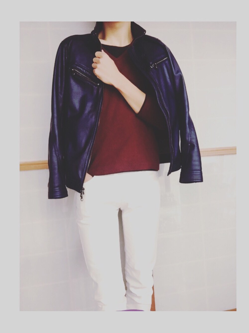着てもよし、羽織ってもよしのライダースです🎶 インナーも暖色系で合わせ、パンツは清潔感を与えるために白にしてみました!