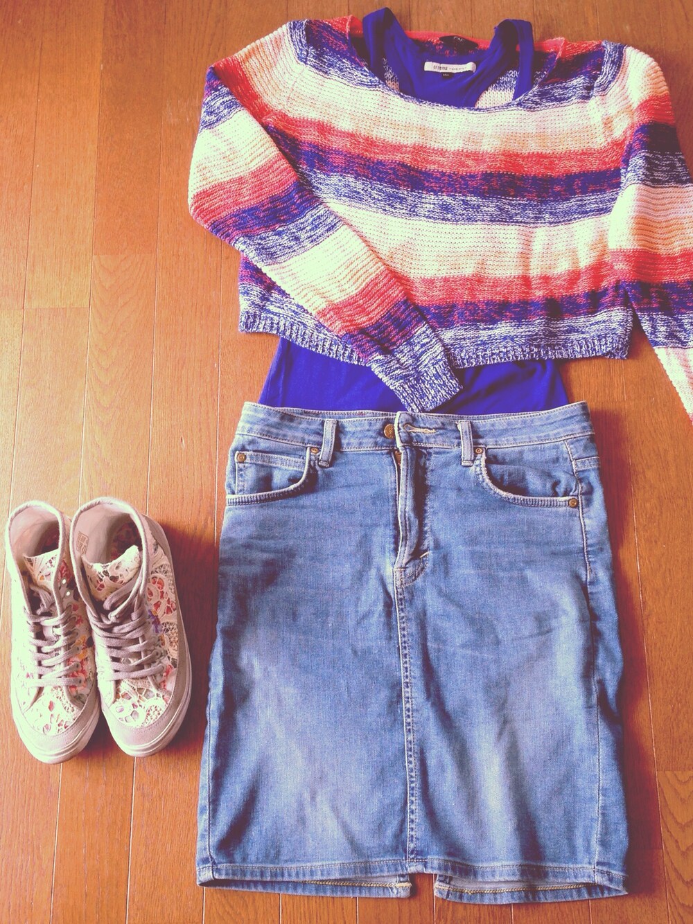 promodのニット/セーター「F&Fのショート丈のサンセットカラー、ボーダーニット。 プラハで購入。」を使ったコーディネート