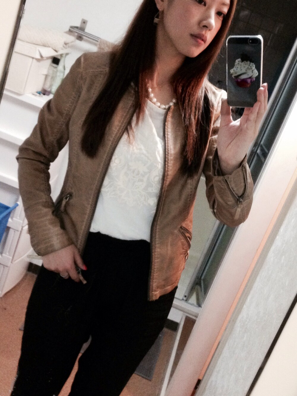 夜のドライブ☆さっと羽織れるベージュのノーカラージャケットは白とも相性が良くてお気に入りです。インナーは敢えてインしてウエストの位置を高めに今年らしく着てみました。