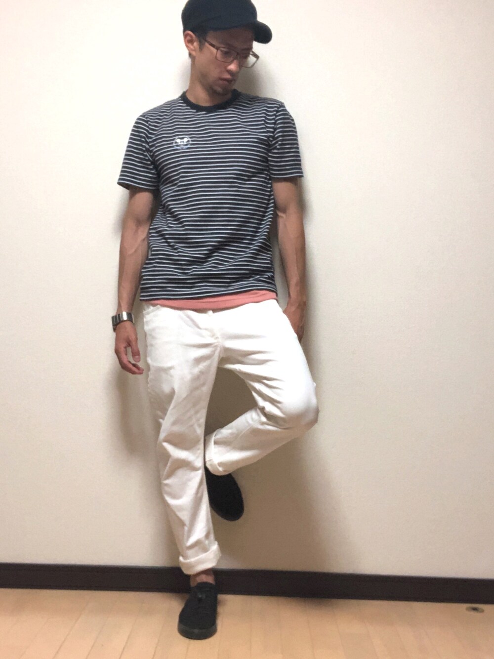 ブラック系のTシャツ/カットソーを着用したメンズの春コーディネートの1枚目の写真