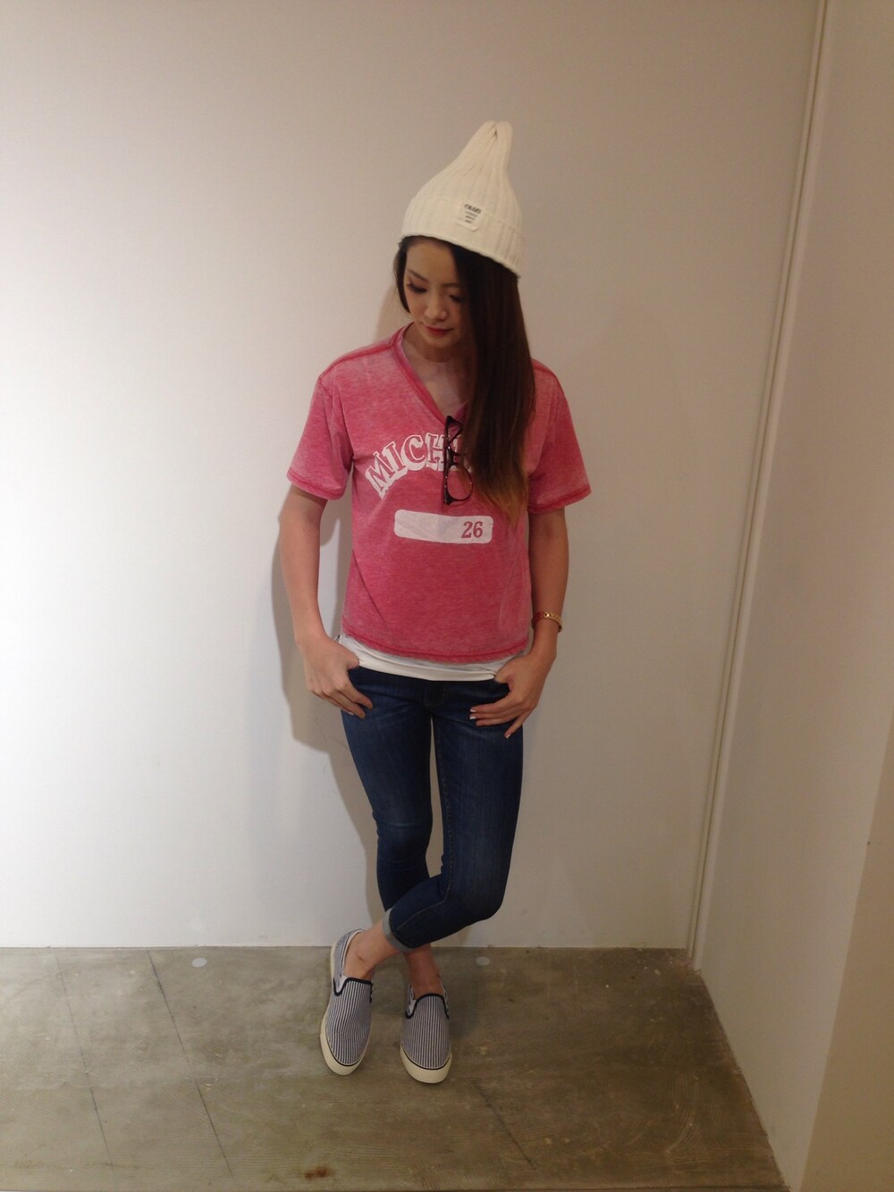 こんにちは( ^ω^ )♪ 今回初のカジュアル!笑 似合わないと笑われましたが載せます٩( •̀ω•́ )ﻭ笑 今回はアンクルスキニーにゆるーくトップスとサマーニット合わせてみました( ^ω^ )! この新作アンクルスキニー色んなトップス合わせられると思うので是非お店でチェックしてみて下さい♡