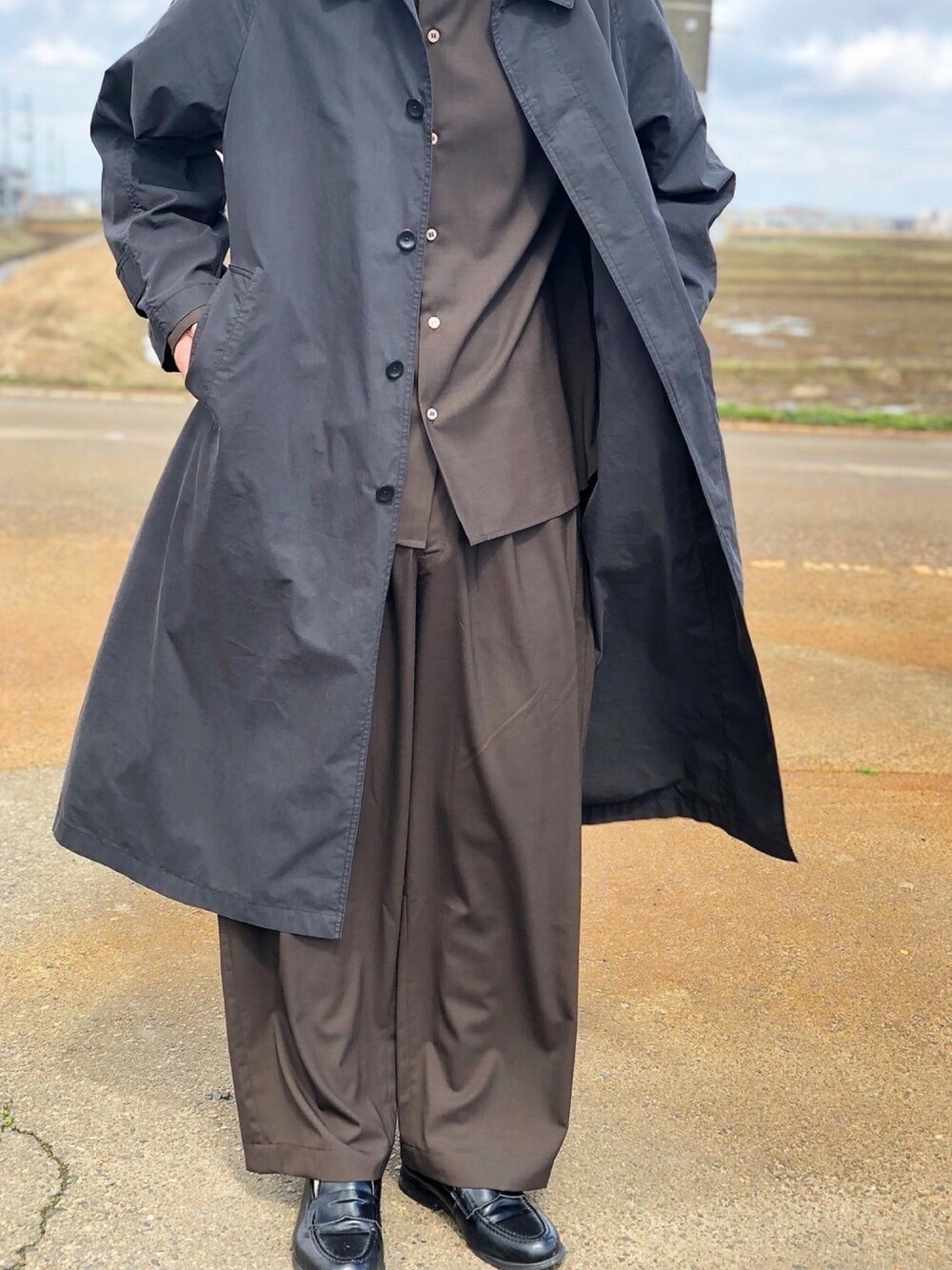 sowellのセットアップでダークトーンコーデです。 暖かくなってきましたね。