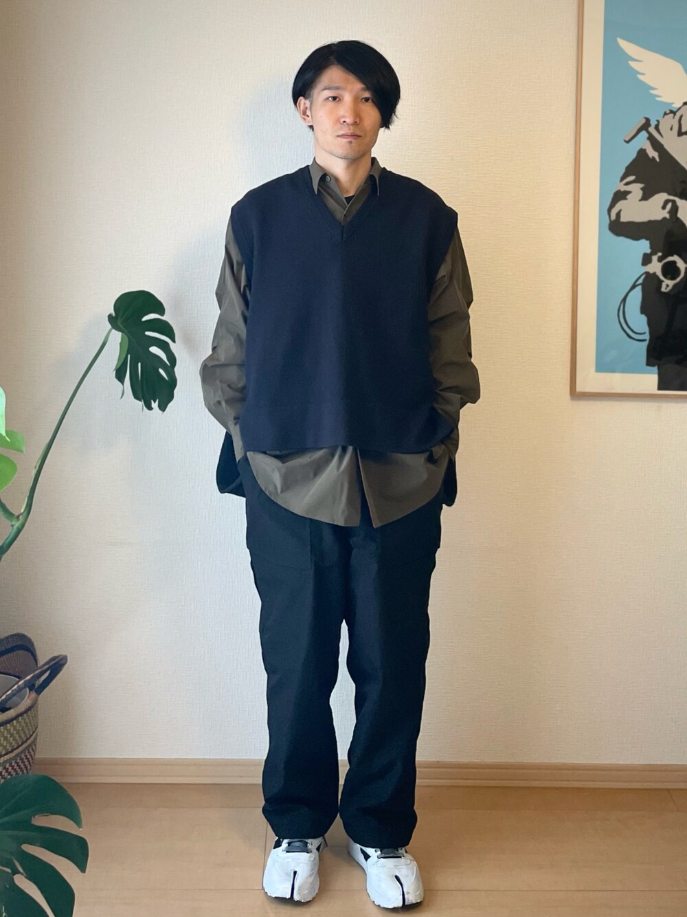 夜間が寒くなってきたのニットベスト解禁です。 冬に向かうにつれて重ね着のレイヤーが増すので、ファッションの幅が広がりますね。 スニーカーはマルジェラのホワイトペイントされたビアンケットカラー。 このビアンケットカラーはマルジェラを象徴するような好きなコンセプトとデザインです。美しい。 黒と合わせると品が出ますね。