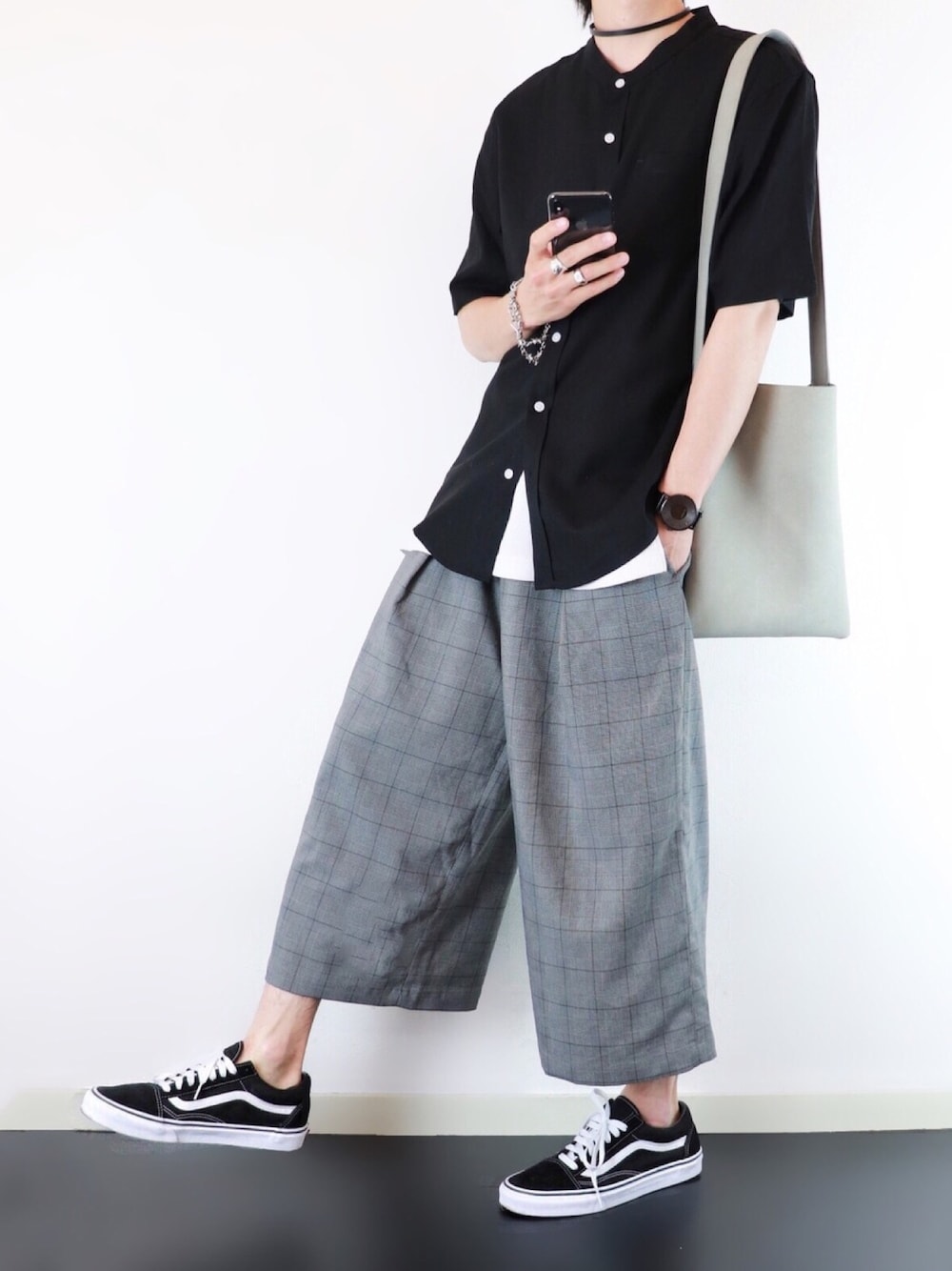 涼しいモノトーンコーデ 🎐 バンドカラーシャツにガウチョパンツを合わせた バンドマンっぽいコーデです🙋♂️ (主観) バンドカラーシャツはモノマートのもので 麻&レーヨンの混紡糸でめちゃくちゃ涼しいです🎐 この生地感なら真夏でもガンガン着れます☺️ ZOZOでタイムセールしてたので 是非チェックしてみて下さい✨ チェック柄のガウチョパンツは バスクマゼンタの新作アイテムです☺️ このパンツ可愛いし超楽チンです🤣 ワイド感が強くてAシルエットを簡単に作れます✨ ウエストに紐があるので ベルトもなしで使えるのがまた良きです! カラー展開も豊富なので 是非チェックしてみてください✨ 【その他SNS】 📸Instagram フォロワー4.1万人突破!! 「ぴたん」で検索してくださると出てきます!