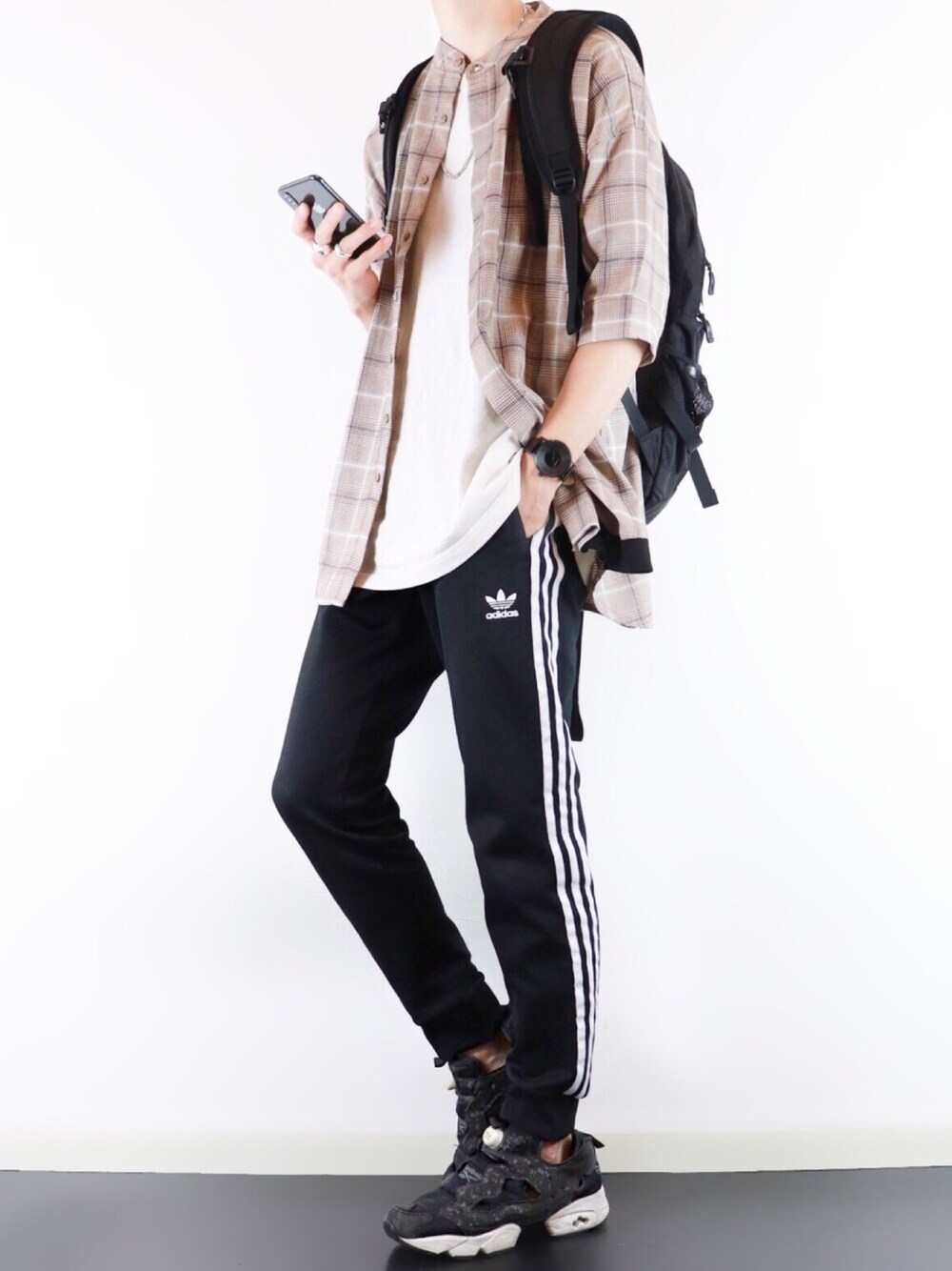 いつも見て下さり ありがとうございます✨ チェック柄のバンドカラーシャツ と adidasのトラックパンツをあわせた 僕の大好きなスポーツミックスコーデです☺️ 以前紹介した My/kan(マイカン)のシャツをまた使いました✨ Tシャツの上から羽織るだけで様になったり 裾の切り替えデザインが可愛いかったりで 気に入ってます☺️ トラックパンツとの相性も抜群です☺️ ポイント! ・黒×ベージュはオススメの色の組み合わせ! ・柄×柄で少し個性的なコーデに! 【その他SNS】 📸Instagram フォロワー5.4万人突破!! 「ぴたん」で検索してくださると出てきます! お仕事の依頼はInstagramのDMにてお待ちしております✨