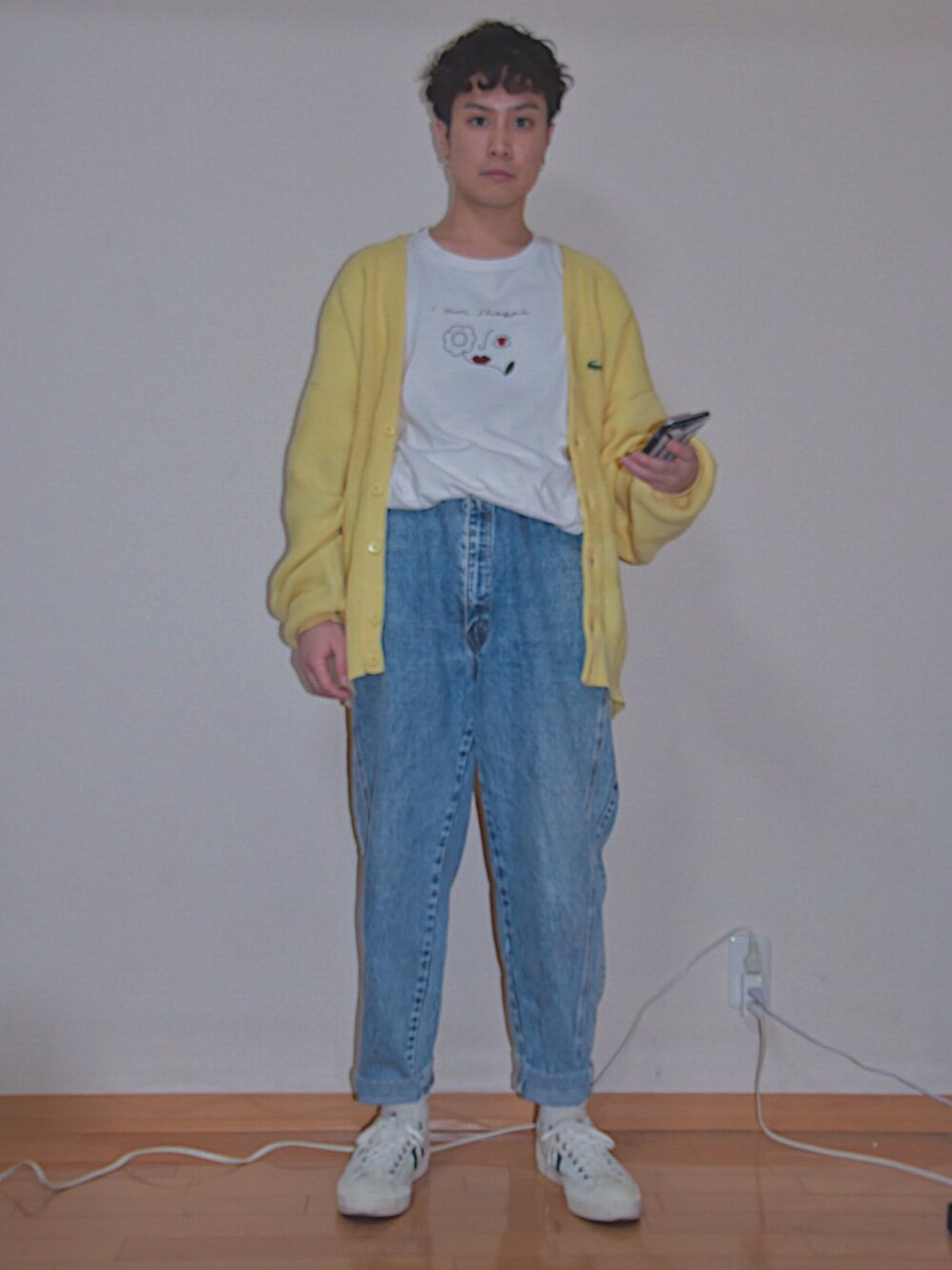 自撮り慣れてない奴が撮るとこうなります。おうちコーデ アメリカの80'sのティーンを意識しつつ大好きなTyler The Creatorを意識したコーデ。 とにかくデニムがビッグです。ラコステのカーディガンとデニムは古着やにて購入。Teeは友達がデザインしたやつです。
