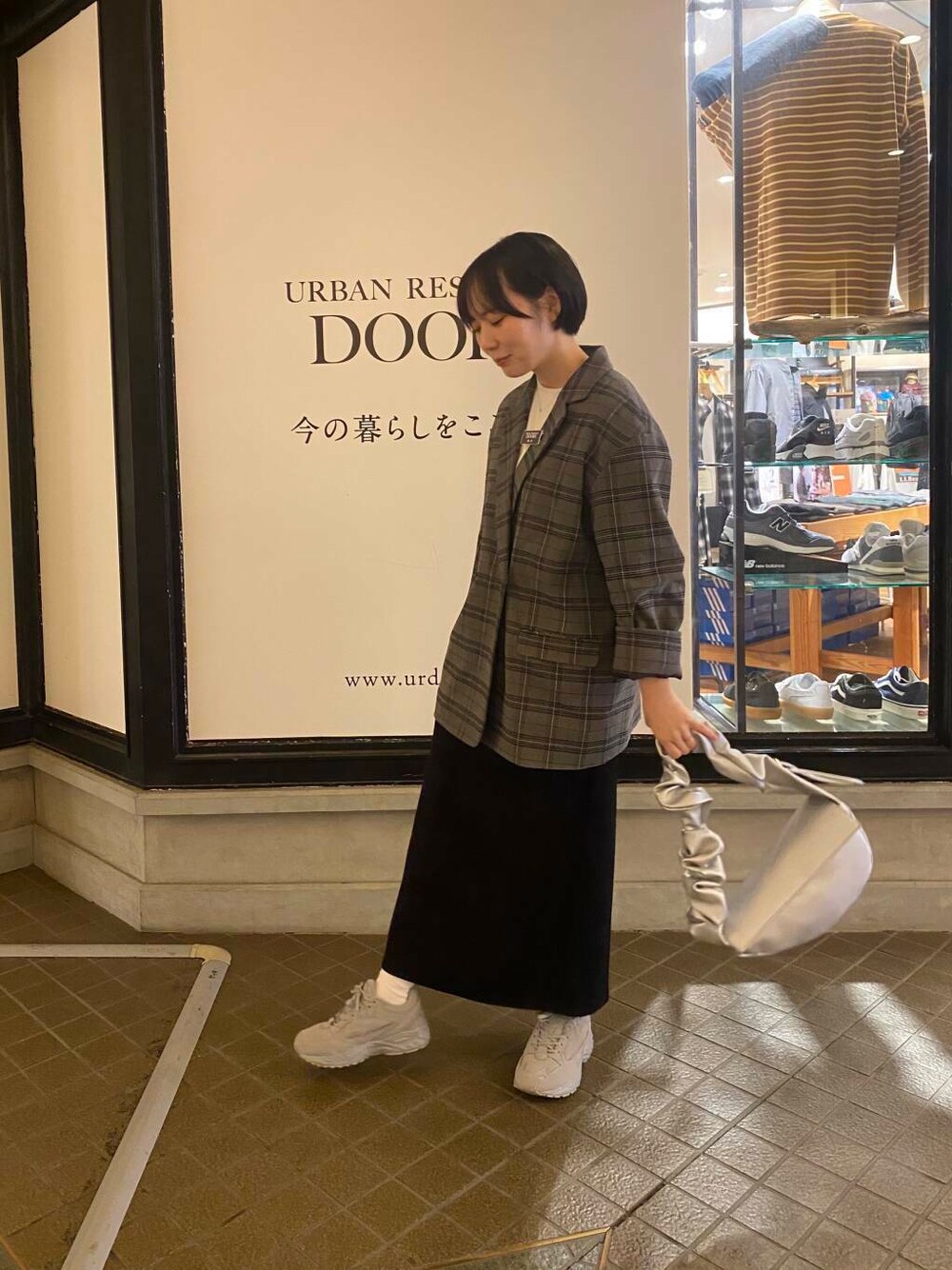 ジャケットをカジュアルに着てみました 秋のお出かけに最適です ジャケットはセットアップも可能です お出かけにもお仕事にも使えますね バッグは持ち手の長さが調節できます 気分で変えられていいですね