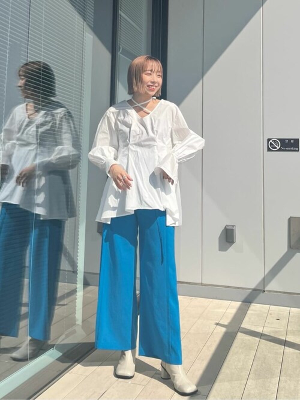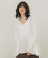 春らしくさわやかなスタイリング。 胸元の開きは気にならないくらいの開き具合です。 お尻も隠れる安心感のあるトップスです!