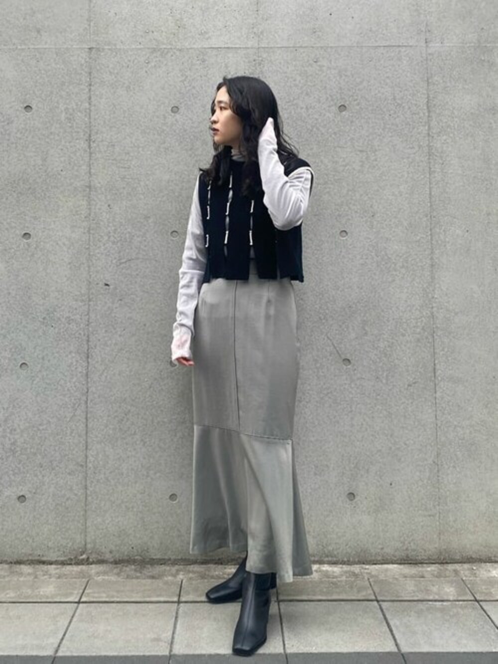 スリットベストセットワンピのベストを活用したコーディネート。ショート丈のベストは何にでも合わせやすさ抜群です!!
