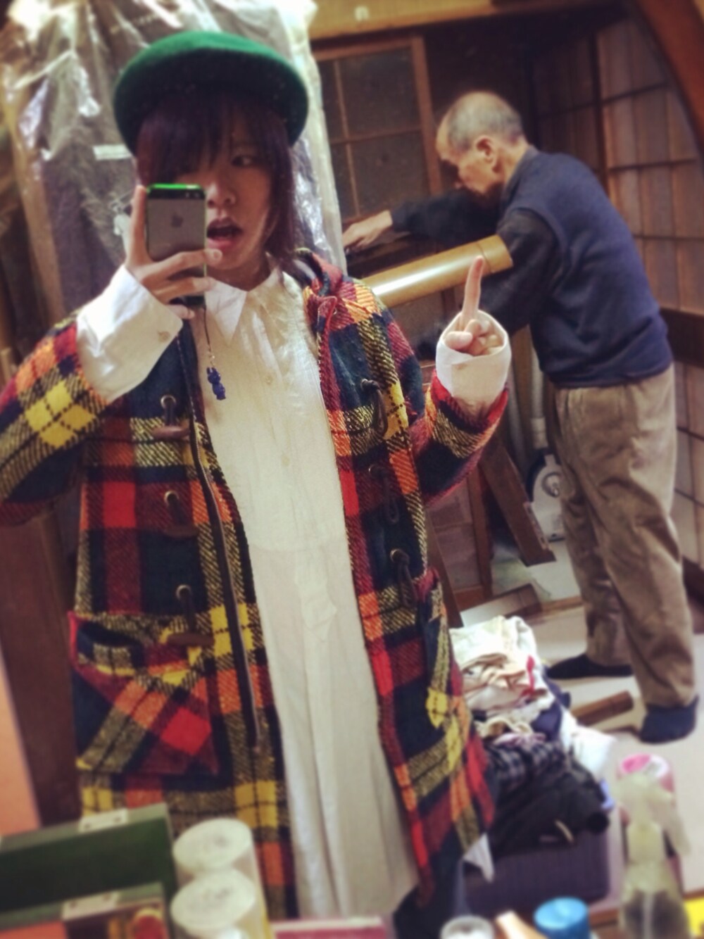 みつもりのダッフルコート「古着 伊勢丹柄のダッフルコート」を使ったコーディネート