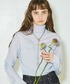 大人気アイテムを詰め込んだコーデです! 馴染みのいい淡いブルーのシアーハイネックにビスチェの合わせは、写真のようにスカートでもデニムなどでもかわいいと思います☻