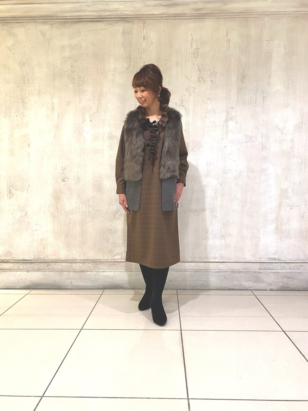ワンピース 30-02-54-129 サイズ1 ベスト 30-02-15-912 サイズ1 首元のフリルがステキなチェック柄ワンピースにファーベストを合わせました。