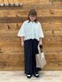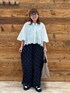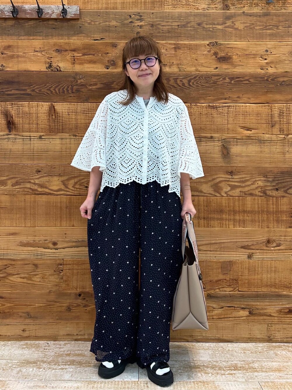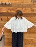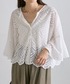 スカラップレースのフレア袖ブラウス! 二の腕しっかりカバーで穴あきなので涼しく着られます♪ ドットのフレアパンツはウエストゴムで楽ちん!