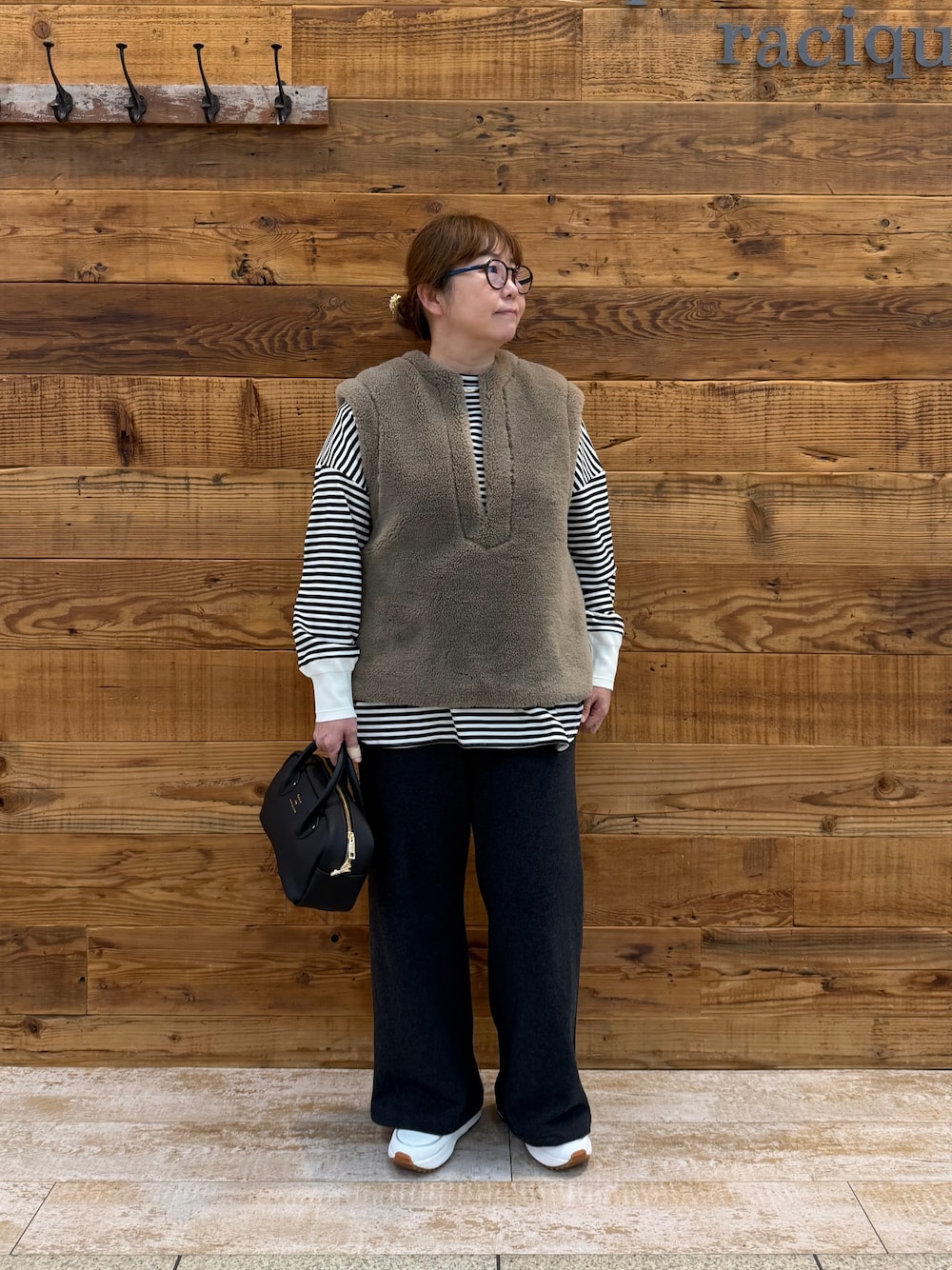ボアベストは裏地付きで温かい! 楽ちんなスウェットパンツに合わせて。