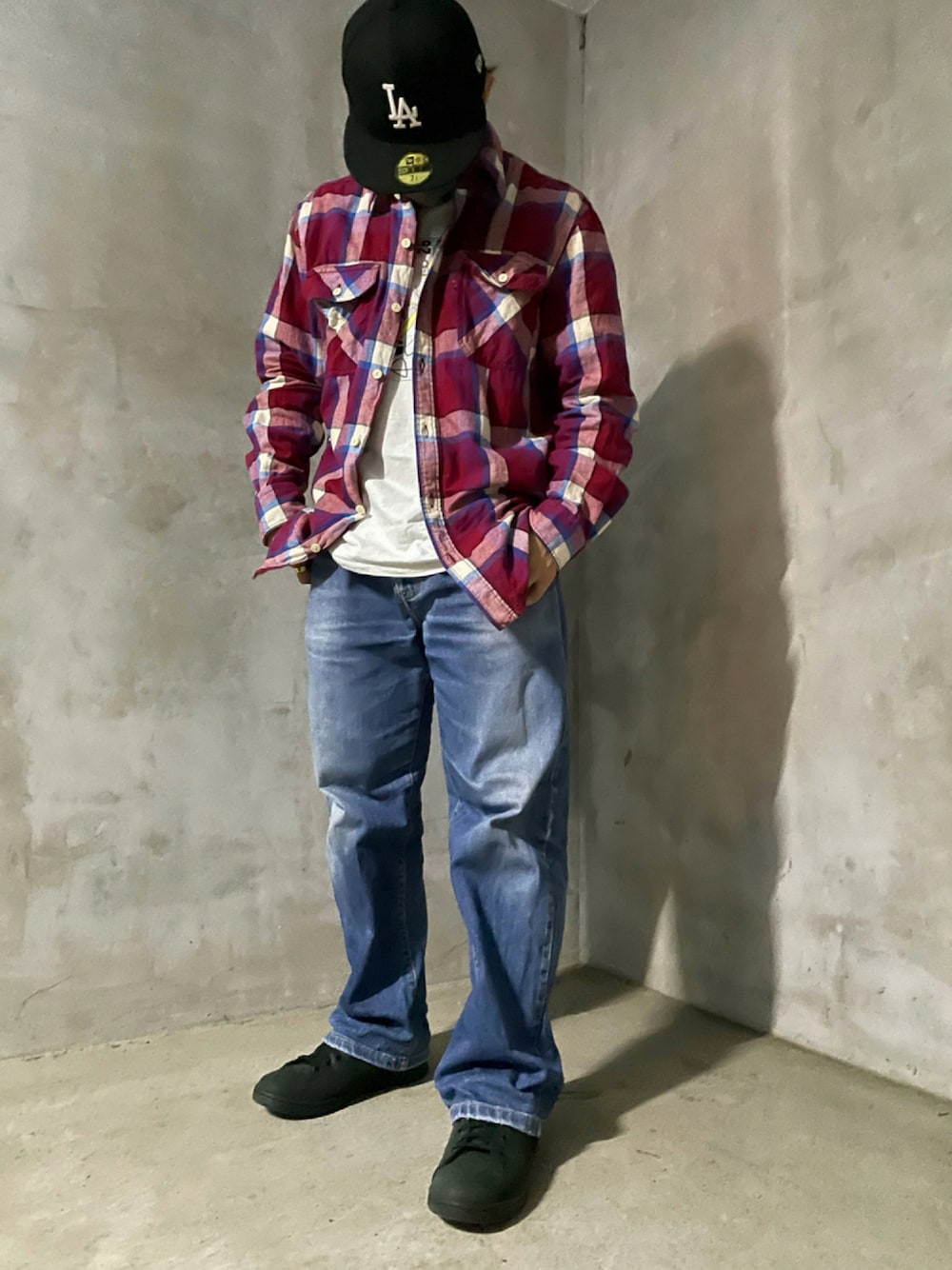 ネルシャツを使ったアメカジコーデ。赤チェックシャツにも青ラインが入っているのでデニムとの相性もいいです。 裾はあえて引きずるスタイルで。
