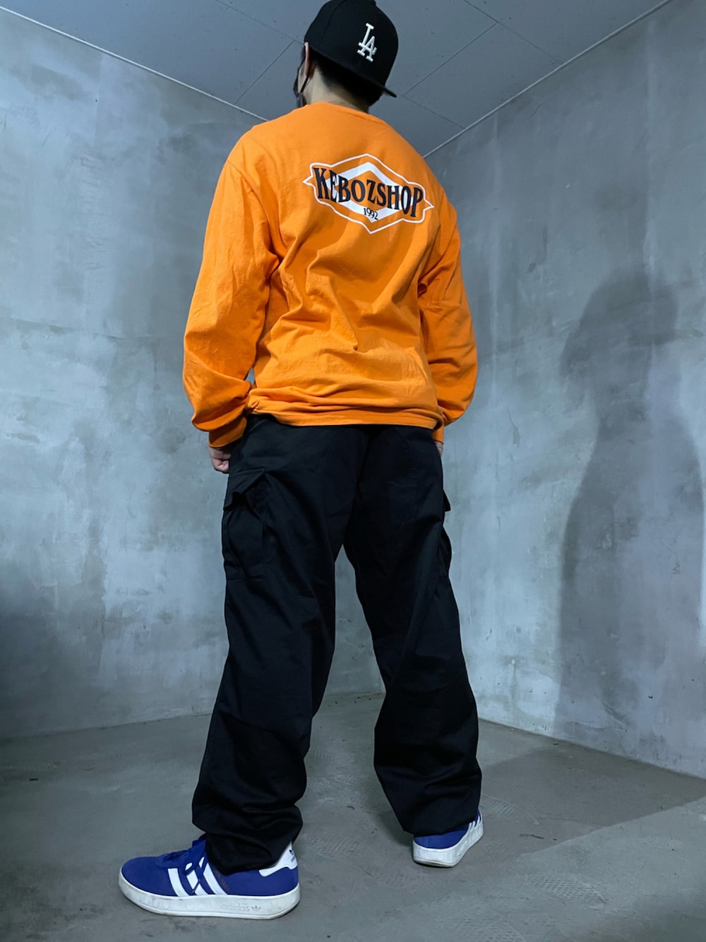 ミュンヘンを履くために組んだシンプルなコーデ。青の補色のオレンジを無彩色を挟んで取り入れることで、トップスとスニーカーの両方を引き立てるコーデができました。