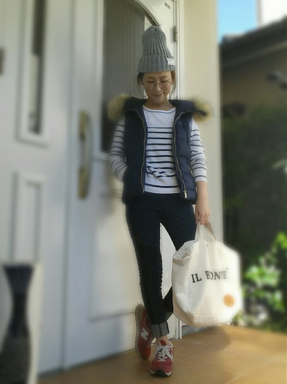 弟くんのテニスの試合観戦コーデ ZARAで買ったダウンベスト うしろがニットになってて とっても可愛い!! ひとめぼれ購入~🙌 シンプルにまとめて 赤のNBが引き立つようにしてみた!! ノーメイクなのでダテメガネで 失礼いたします🙌