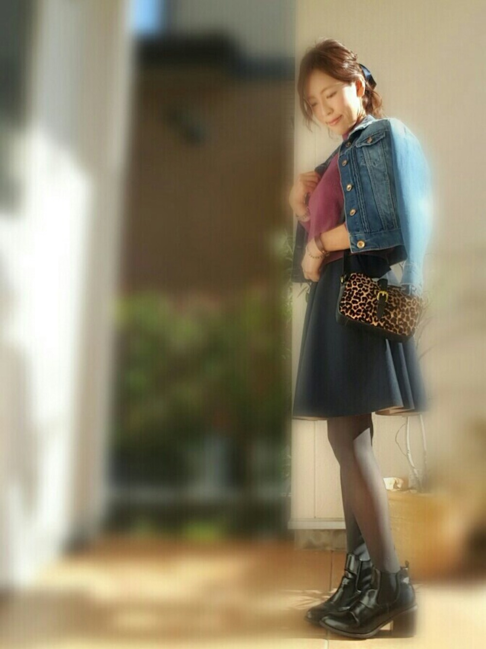 昼間だけのお出かけわ 暖かいからGジャンが多いです 今日わ珍しくスカート ちびっこいので膝くらいの長さで トップスを丈みじかめに ヒールを合わせてバランスよく トップスの赤みがかった紫を ポイントにしてみました