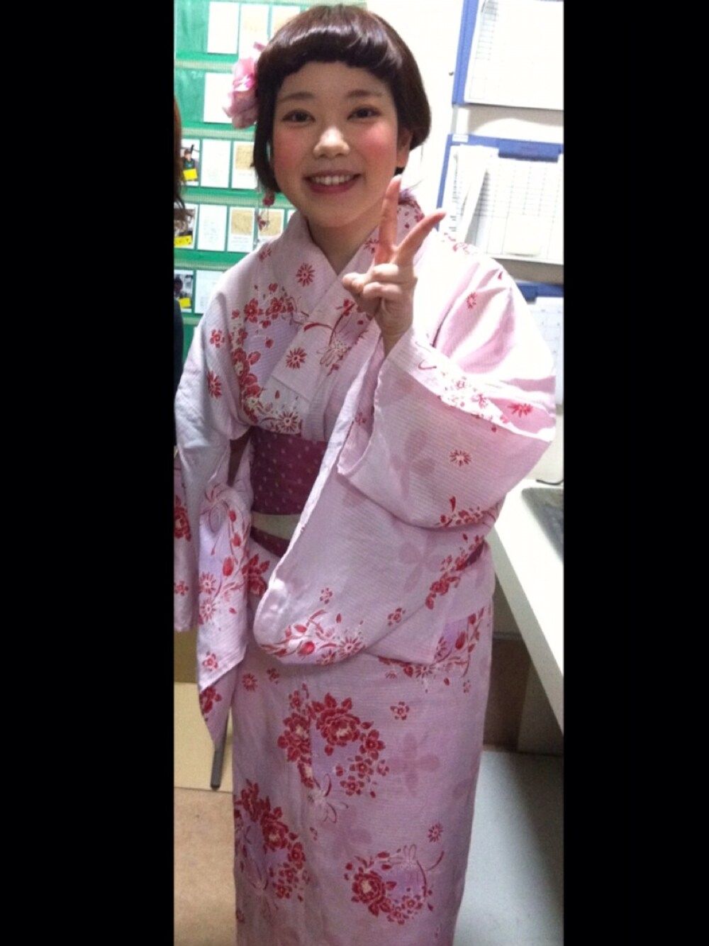 昨年の仕事でのイベントで着付けしてもらいました∩^ω^∩ 帯は着付けしてくれた先輩の帯☆ 前髪が巻きすぎてぐるんぐるん…