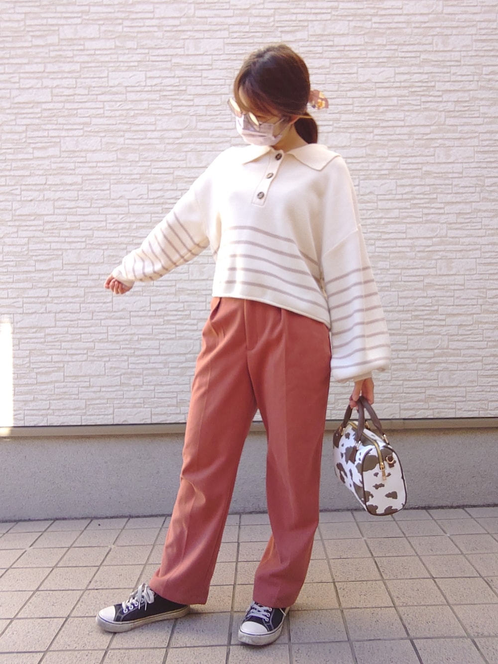 ご覧いただきありがとうございます。 今回は、カラーパンツコーディネートです。 しまむらのオレンジのカラーパンツと、最近購入したベージュのボーダーが入った衿付きトップスのゆったりコーデです。 衿つきトップスは色々出ているのですが、べっ甲っぽいボタンやボリューム袖が可愛く、クロップド丈で裾が丸まっているところや下半分だけボーダーが入っているデザインも好きだったので、購入しました。これからどんどん着ていきたいです! また、近藤千尋さんのコラボであるFLASHBLUEの、ブラウンのカウ柄ボストンバッグも可愛いポイントです。 トップス···しまむら(Khalita) ジョカード衿つきボーダープルオーバー M 濃薄橙 商品番号 529-0969 バッグ···しまむら(FLASHBLUE) 淡茶 商品番号 343-1162 ♡や+をいつもありがとうございます(^^) とても嬉しいです(*´∀`*)