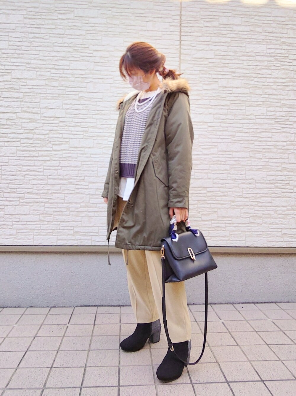 ご覧いただきありがとうございます(*´∀`*) モッズコート&ニット+ブラウス&パールネックレスのきれいめカジュアルコーデです。