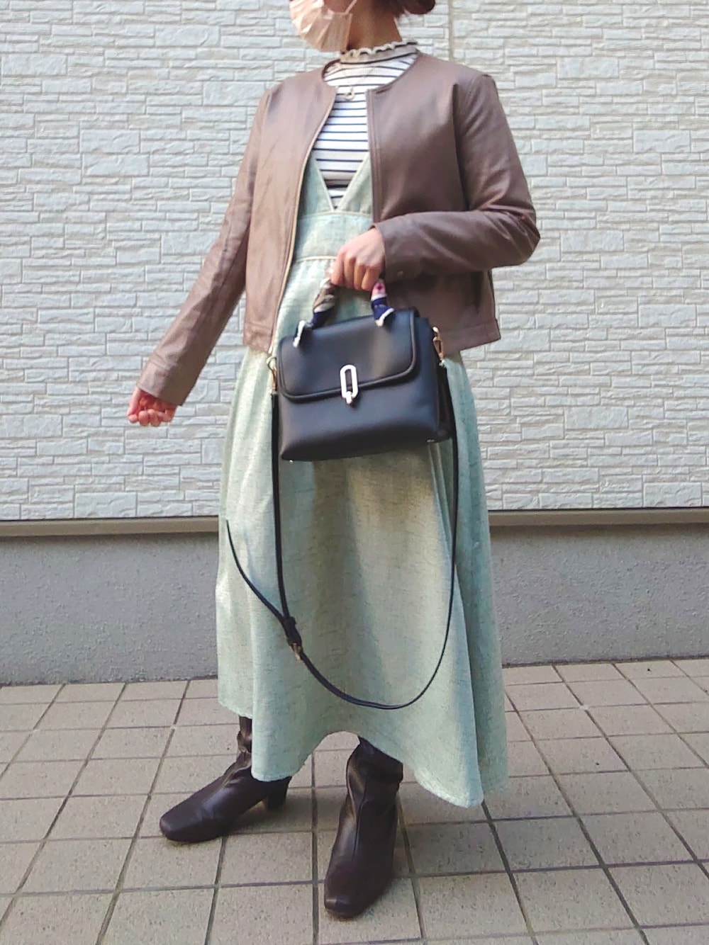 ご覧いただきありがとうございます! Green Pearksのジャンパースカートを使った着回しコーディネートです。 ボーダートップスやレザー調の小物を使って、カジュアルコーデに…