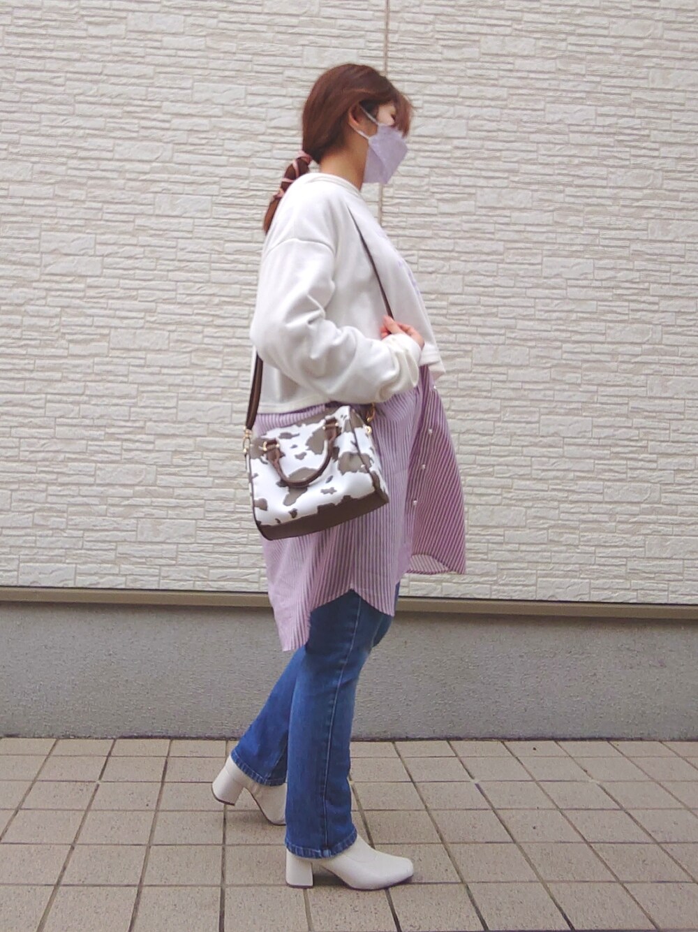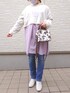 ご覧いただきありがとうございます しまむらで大きめサイズのところで発見した、ボタンがパールで可愛く、前後2WAYとボタンで長さ(形)を変えられる袖の2WAYという高機能のパープルのストライプシャツの着回しコーディネートです。 ロゴが刺繍されているクロップド丈のパーカーと合わせたコーデです。でも、なんだか太って見える気が…(^_^;)
