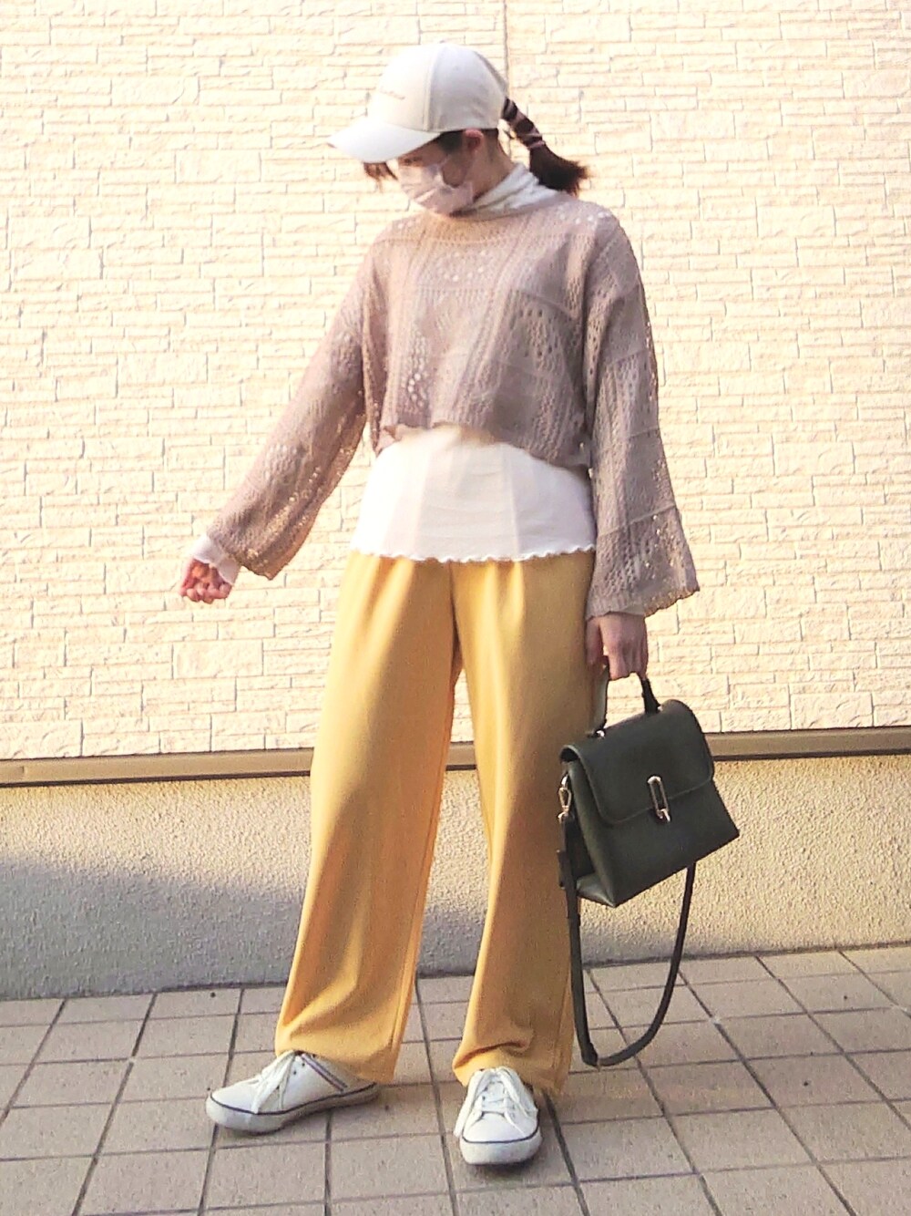 ご覧いただきありがとうございます! トレンドのシアートップスに、最近しまむらで発見した可愛いレース編みニットと色に一目惚れしたカットジョーゼットシェフパンツという種類のカラーパンツを合わせたコーディネートです! ニットはデザインも形も可愛いし、絶妙なイエローカラーのパンツも可愛いです…(*´∀`*)