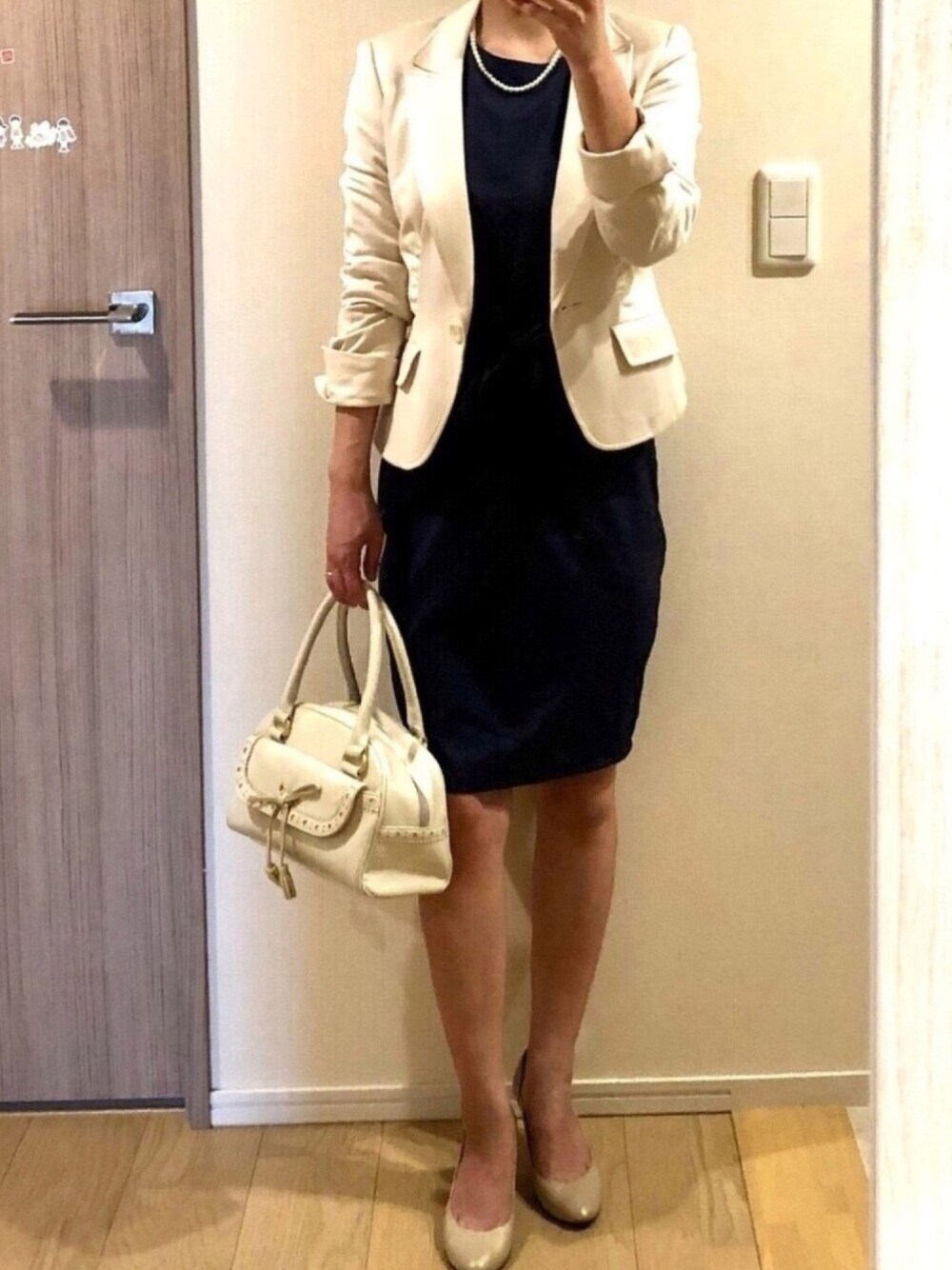🌸もうすぐ入学式①🌸 卒園式コーデのワンピース。 ジャケットを白に変えるパターン。 ネイビー×アイボリー 私の中で入学式の鉄板カラー🙌 ジャケット15年物😂 ジャージー素材の柔らかさとアイボリーの淡い色合いで優しいお母さん感UP⇧ 見た目だけでも優しく。笑