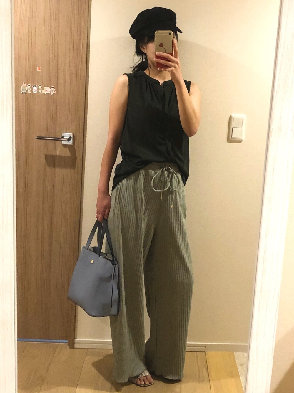 きまわしー。 おうちからお出掛けチェンジ🛍 トップスチェンジの帽子オンで。 ノースリーブは深ーい緑。 いつも色が分かりにくい💦 渋色で大人っぽく😋 いつもいいね、お気に入り、フォローありがとうございます✨ お返しできる時に伺います🙂