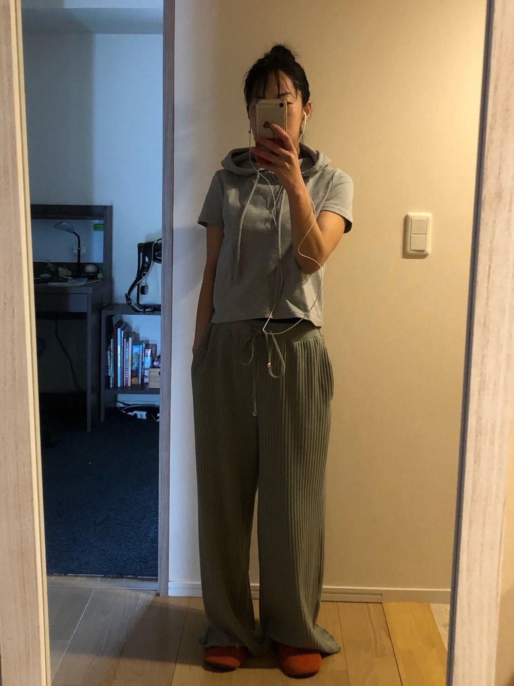 グレー系のパーカーを着用したレディースの春コーディネートの1枚目の写真