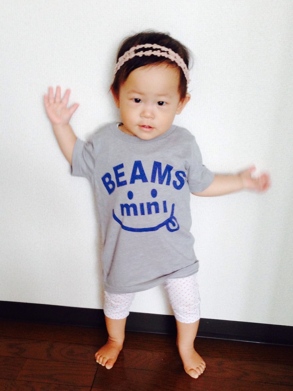 papaが選んだTシャツ♡ 髪の毛ないから、グレーだと男の子みたいになった(´・ω・`;)せめてもと思い、mamaのカチュームをしてみたけど、、、どぉかな? しかも、Tシャツ90がぶかぶかでワンピになってます(笑) 娘、最近10秒くらい立っちが出来るようになりました✧