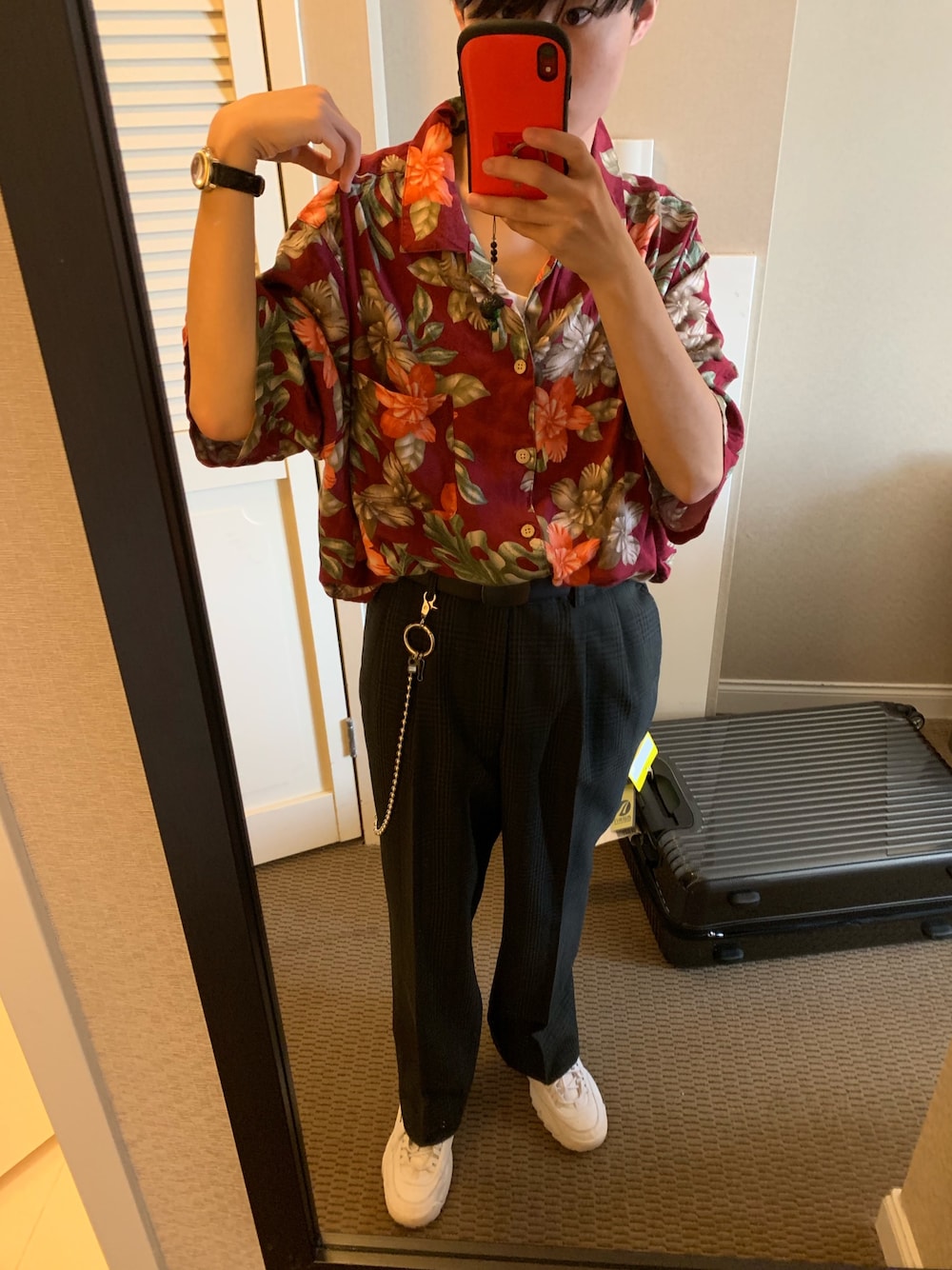 オール古着です ワイドめのスラックスパンツをつかいました! 多分ゴルフウェアーなのかな? ビックすぎめのアロハは柄がよきですね👍🏻👍🏻