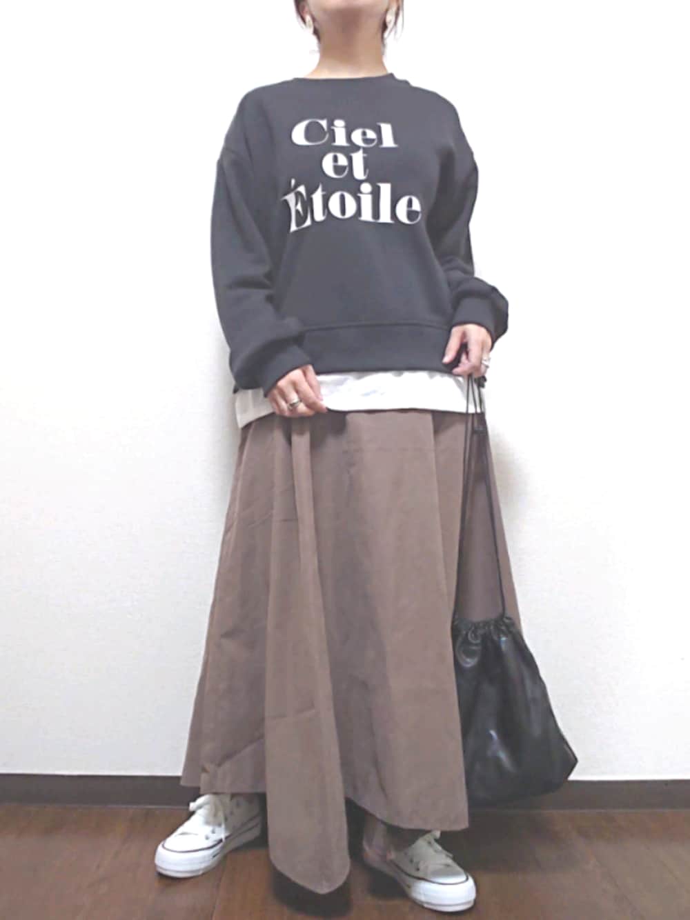 上下しまむら♪ 先日、かなり久々に『しまむら』へ行きました。 多くの方が着ている、このロゴのシリーズは欲しかった☆レイヤード風のスウェット、一枚でラク✨しかも暖かい👍 色は迷いましたが、クールに見えるチャコールに😊 スカートもシルエットとスモーキーな色に惹かれて♪ 前回のコーデ、masakazuさん、素敵なフォルダイン有難うございます🙇🙇🙇 皆様のところには、後ほどゆっくりお邪魔させていただきます😅 ご覧いただき有難うございました🙇