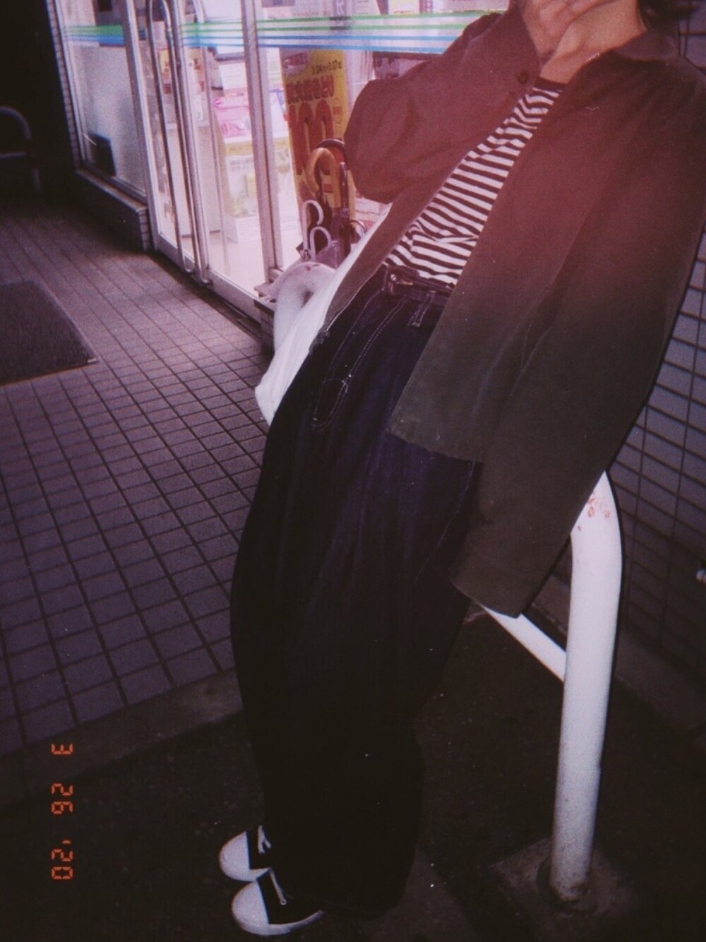 最近髪をくるくるにするので服はシンプルにしたい ベタな合わせだけど、古着のジャケットは袖がすこし長め、ちょっとしたバランスで個性出してくスタイルで✌️ 夜のコンビニでコーヒー買って海に行きました