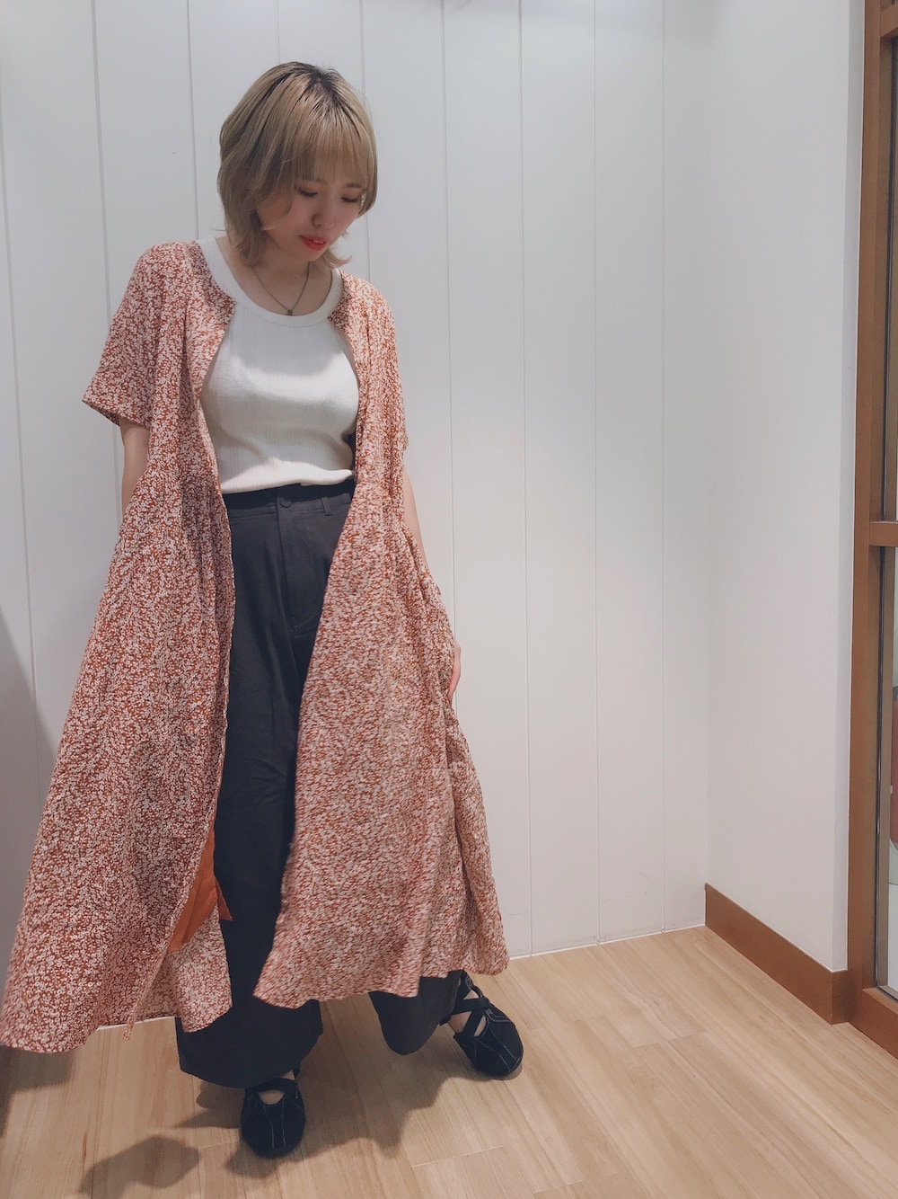 あちちだったりジメジメな日々続いてますね〜itoです🐸 リップル花柄ワンピちゃんとても軽いので羽織りで着てみました🌷とてもkawaiiカラーですよね🍊 色物ってブラックと合わせるとキツくなりがちですけど、このダーツパンツのブラックは墨黒で優しいカラーなので色物との相性も抜群💮な仕事人なのです😌👌 写真では見えないんですが、このパンツかなりシルエットが良いです、かなり! 個人的にウエスト周りのシルエット重視でパンツを選ぶので、圧倒的にタックよりダーツ派なんですよね〜🥰 その方がスッキリしやすいです‼︎ さらっと着れるアイテムでジメジメを乗り越えましょう〜🤘✨