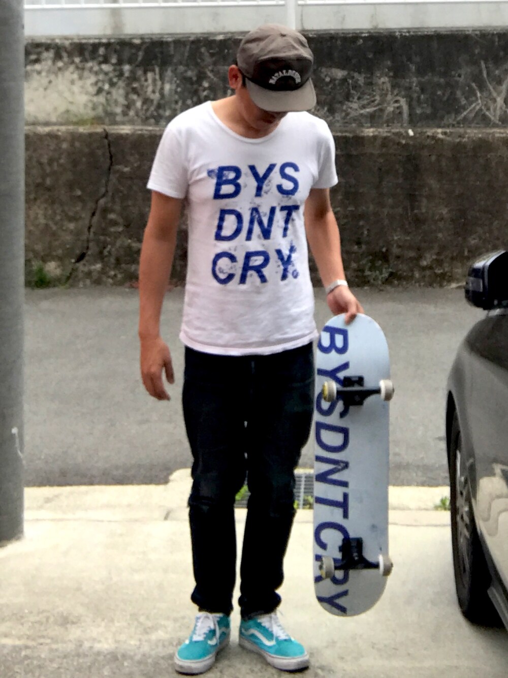 ポイントはお揃いのスケボーとTシャツ。