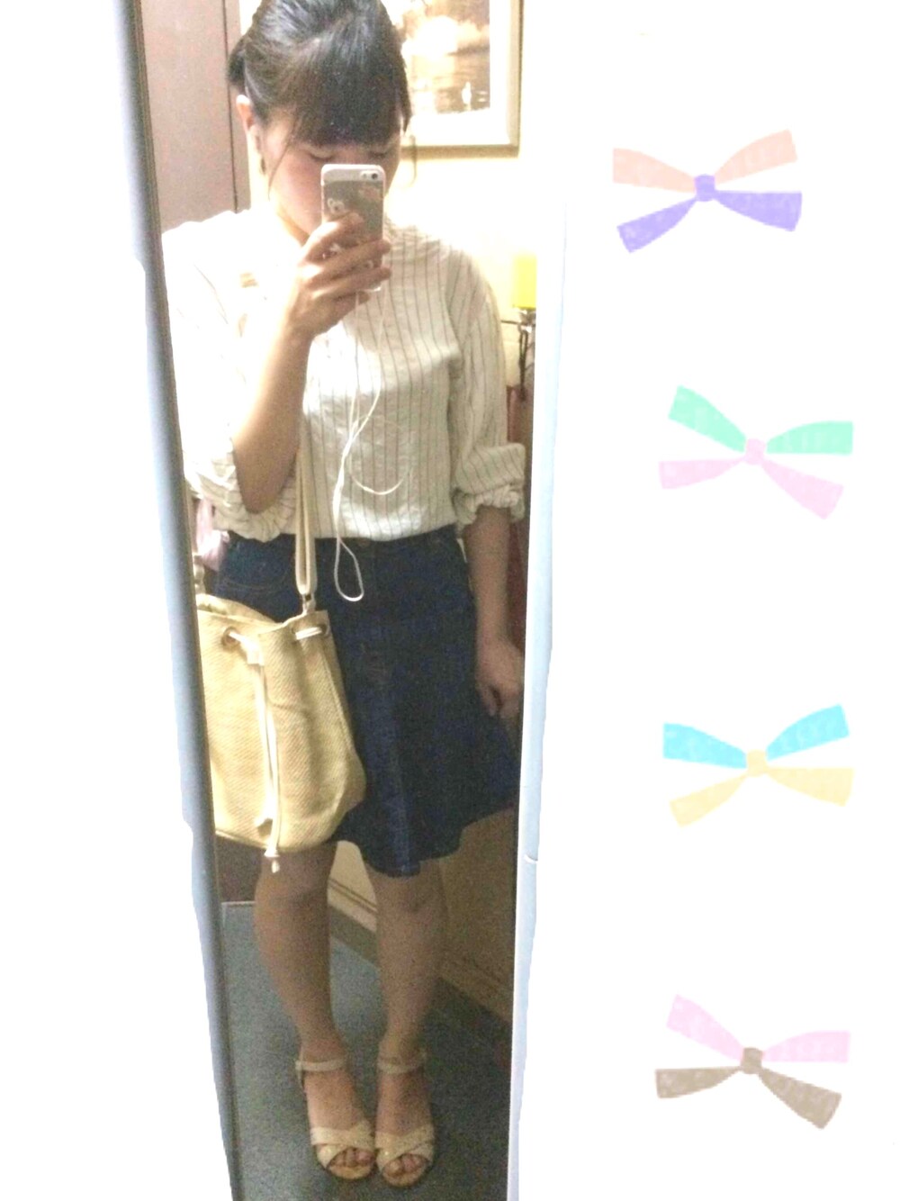 トップス:しまむら デニムスカート:gu サンダル:不明 巾着バッグ:ショコラフィネローブ 今日はお休みだったので、洗濯やらお買い物やら。 あっつかった… バラ達の手入れもしたので、焼けたかも〜(*´・ω・。) 短い髪を無理くり結わいて(笑) トップスのストライプで縦長に見えるといいなと…←