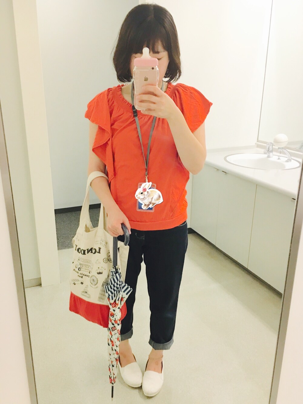 トップス:gu デニム:ハニーズ バッグ:ジーンズメイト スリッポン:ヒラキ 今日のお仕事着です☕︎ オフショルなのに普通に着ちゃってます← もう8月も終りかけなのに、まだまだ暑いですね… 冬が恋しすぎます。 バッグも傘もイギリス柄🇬🇧 大好きイギリスっっ(言ω言)♡♡♡ どんどんイギリス関連のものとうさぎ関連の雑貨等が増えていく。