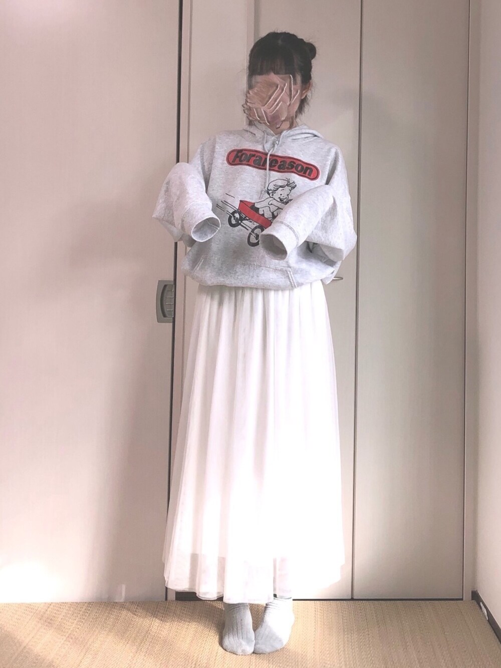 こんにちわ🐰💭💕 今日はゆるゆるコーデにしました👶🏻 このパーカー、FOR A REASONっていうパンクバンドのグッズなんです!! めっちゃ熱くてカッコいいおじさん達のバンドです。 お子さんもいて働いているおじさんが、バンドの時は激しい熱いロックやるって、かっこよすぎませんか、、、?🙊💭 そんな彼らのグッズは、とにかくデザインが可愛くて おっきいサイズなので、ゆるく着れるんですよ〜🤤💕 シフォンスカートって意外と使いづらいけど、トレーナーをインして着るのが好きです🎵