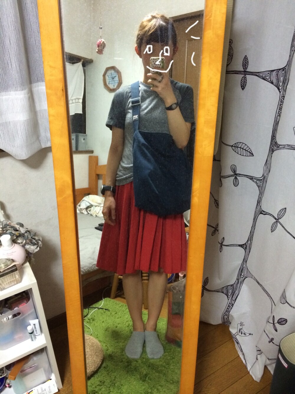 久しぶりに、部屋での投稿です。 左側の棚が生活感丸出し( ゚д゚) 久々に赤いスカート履きました♪ セールしてますが、セールしてないものを2つ買いました。 買い物すると、物欲がふつふつ出てきます。。