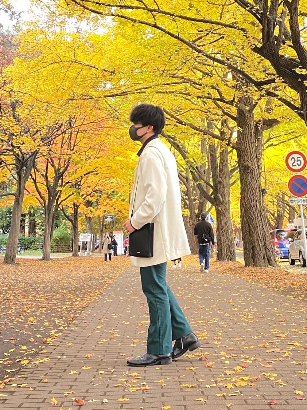 初投稿です📸 沢山の投稿の中からご覧頂きありがとうございます🙇♂️ 〜今回のコーデ〜 outer ▶︎ HARE オーバーテーラードジャケット inner ▶︎ RAGEBLUE マーブル柄シャツ pants ▶︎ ADRER ストレートパンツ shoes ▶︎ SPINNS ヒールブーツ bag ▶︎ HARE ショルダーバッグ いちょう並木に合わせたキレイめスタイル